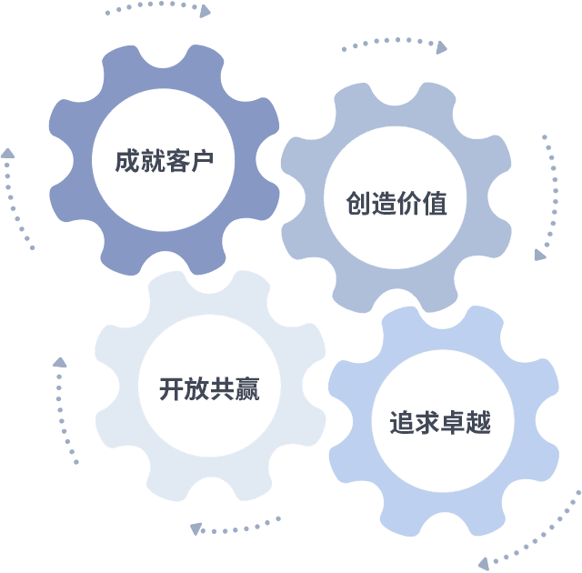 成就客户是一切决策的出发点,,创造价值是衡量所有工作的标准,,追求卓越是我们做事做人的态度,,开放共赢是我们的格局也是最终的结果。。。。价值观的齿轮环环相扣,,,推动着组织里的每个人不断向前。。。